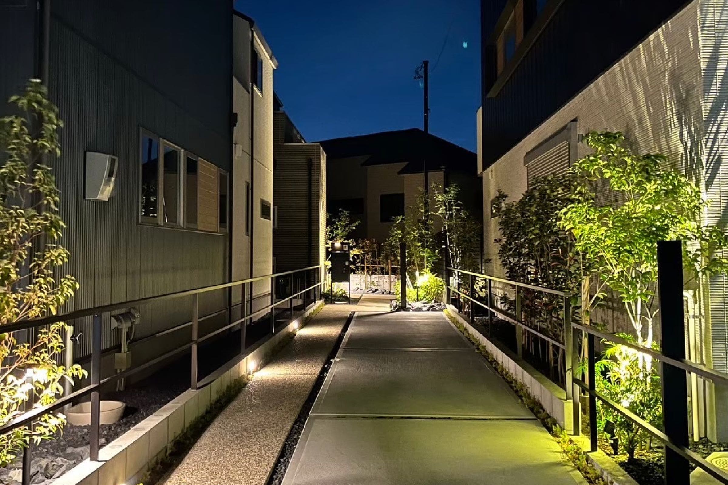 昼間は器具の目立ちにくいスパイクフットライトが、夜の専用通路の足元をしっかりと照らしています。