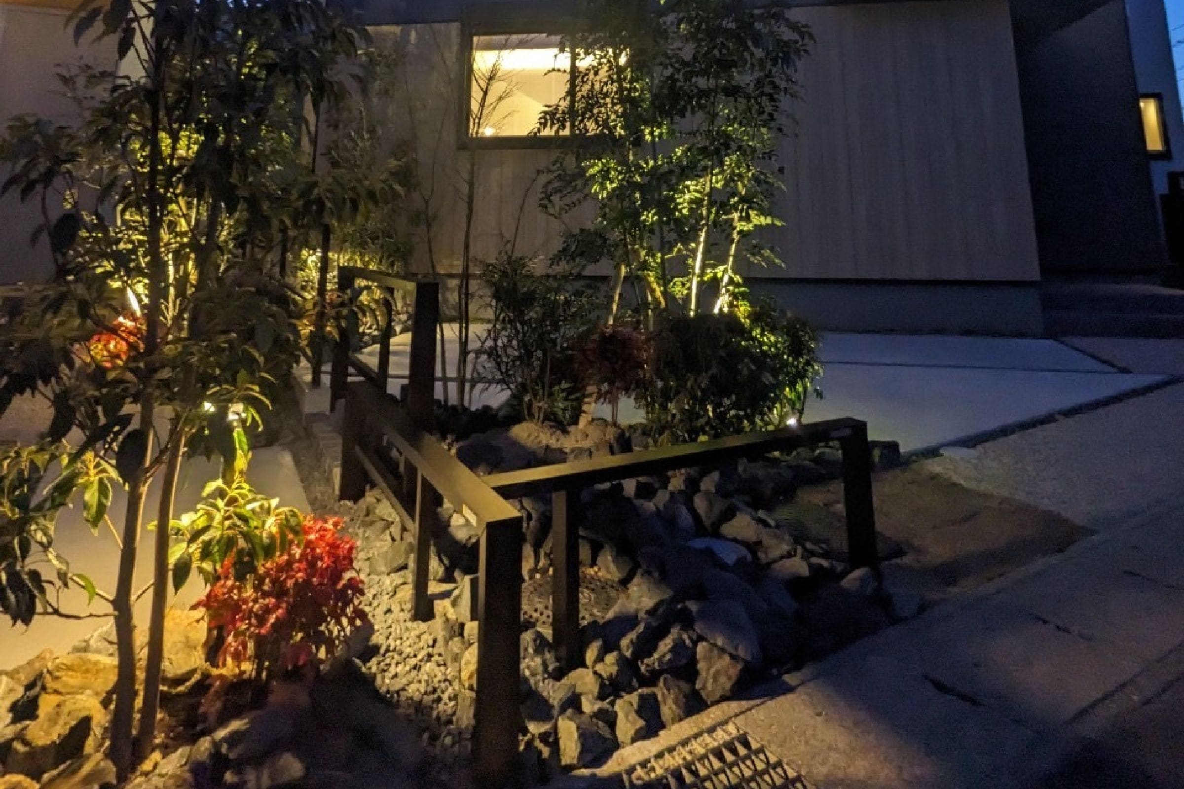 植栽部分に設けた、高さや形状の異なるアイアンフレームの組み合わせがアイキャッチになっています。
