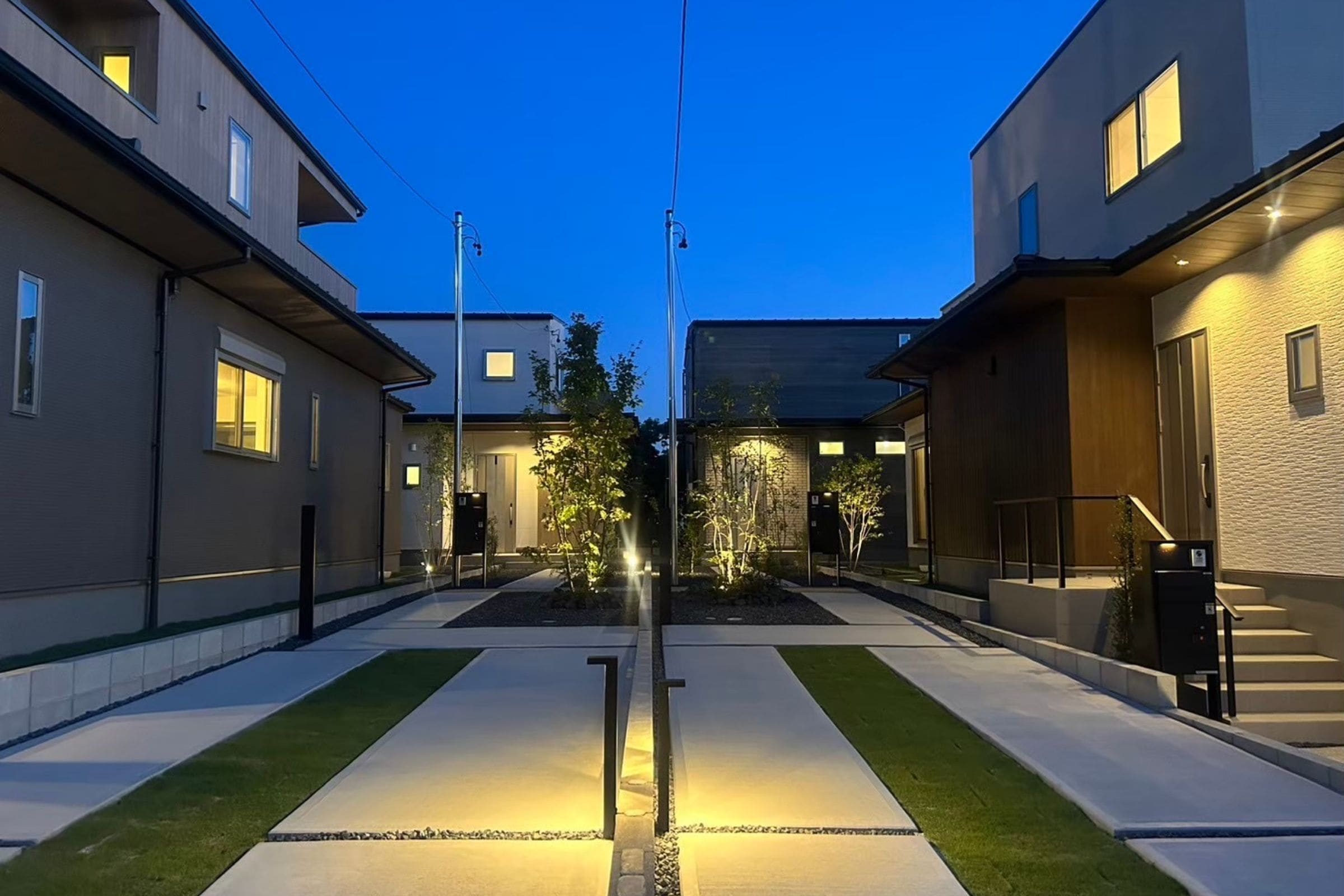 昼間は器具の目立ちにくいスパイクフットライトが、夜の専用通路の足元をしっかりと照らしています。